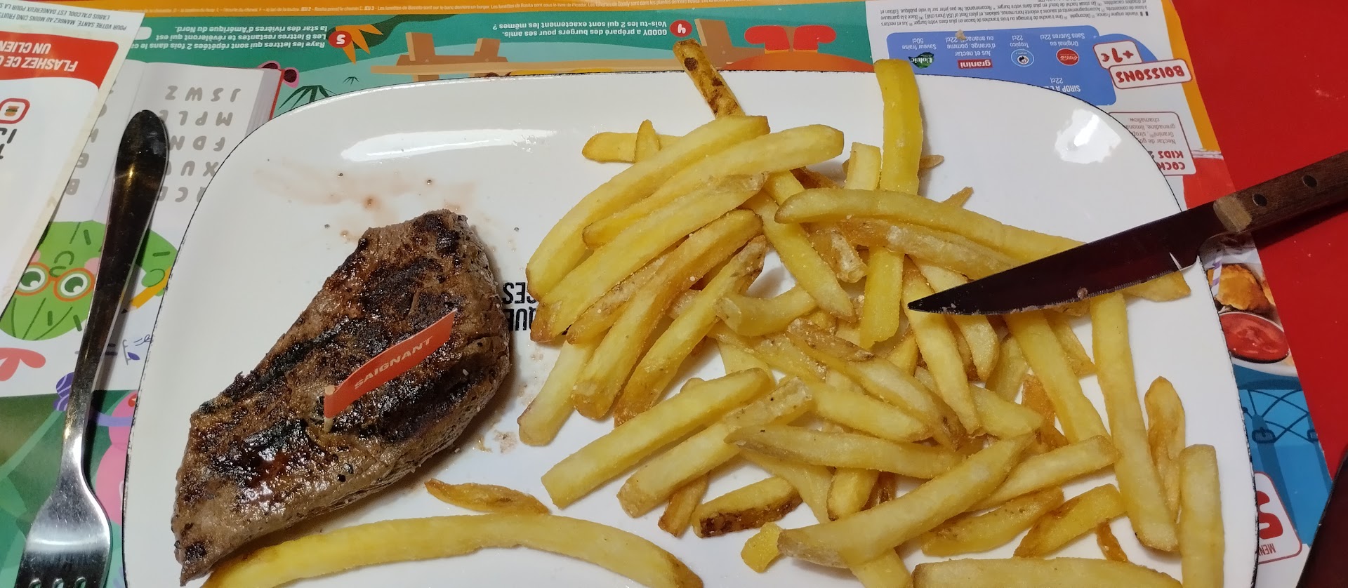 Read moreBon repas. Les plats sont bon de même pour les accompagnements notamment les sauces qui sont vraiment bonne. Le seule bémols du repas à été la cuisson, les cuissons ne sont pas respecté. 4 plats sur 5 avaient la mauvaise cuissons, bleu en saignant, les plats à point étaient bien cuit voir parfois charbon à l’extérieur et intérieur limite. En outre il faut vraiment veiller à respecter les cuissons SURTOUT dans un établissement qui vend en grande majorité du bœuf. Enfin les desserts sont excellents, c’est assez rare maintenant de voir le nom « carte d’or » et que ça soient vraiment du carte d’or, parfait surtout la glace avec le brownie. Pour finir le service a été niquel, par ailleurs, l’ambiance est bonne comme un restaurant normal mais les enfants qui crient rendent l’ambiance impossible parfois.