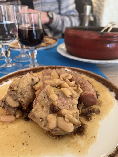 It arrived at my table in the cassola with a beautifully caramelized crust under the tender white beans and meaty morsels . You also get a Cassoulet 101 in rapid fire French. The upshot is you are served the meats ( pork sausage, pork rib, confit of duck) in a thick bean stew.