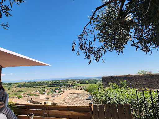 A wonderful café-glacier about 50 steps below the castle. The location is fantastic, with a sweeping view of the Rhône valley and Mont Ventoux. Service is unpretentious, attentive, and very friendly, and the charcuterie and cheese plate is delicious. A small but well-chosen wine selection lets you sample local reds and whites at reasonable prices. The shaded terrace offers welcome respite from the sun, with a light breeze easing the short climb up from the village below. Compliments to the owners for creating such a delightful, unassuming place. Even the restroom is neatly decorated, tucked away behind a wooden fence with a natural stone serving as sink. It feel like it has been done thoughtfully and with attention to detail. We would come back anytime...