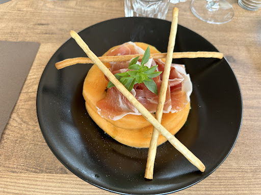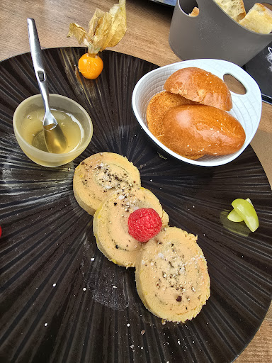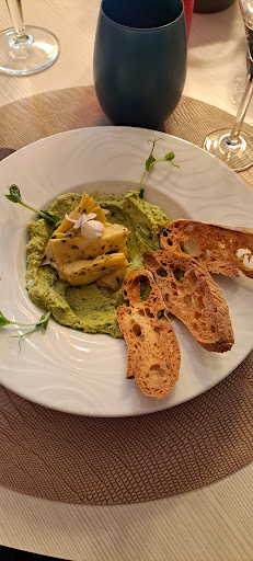 You can choose between two menus or either have one of the meals from the menus. The starter was a great variety of vegetables made in different delicious styles. You can have meat as well as a starter, but I am vegetarian. There was only one vegetarian main course but it was very delicious with fresh grilled artichokes, pine nuts and good pesto. My partner had squid with red rice from the Caramargue and additional vegetables. All very nicely decorated and well seasoned. The Creme brûlée was perfect with a slight taste of muscat wine. I had strawberry Tiramisu - fantastic taste! We sat outside, shielded from the wind and they played some nice jazz music - not too loud. All in all -...