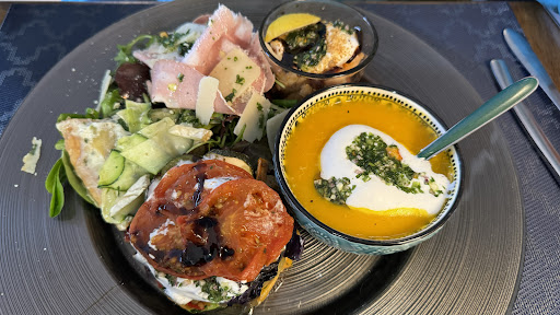 Lors de ma visite, jâai commencĂ© par une salade caprese gĂ©nĂ©reuse, oĂč la burrata crĂ©meuse se mariait parfaitement avec des tomates juteuses et du basilic frais. En entrĂ©e, le veloutĂ© carotte, ricotta et cannelle offrait une texture onctueuse et un Ă©quilibre subtil entre la douceur de la carotte et la chaleur de la cannelle.