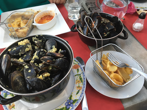 avons ^ris des moules,une honte ,tiede,nombreuse fermees ou vide,peut etre les restes de casseroles d autres clients,et j ai remarque que cest la femme de menage qui travaillait en cuisine,on m'a kaisse entendre que le chef etait parti.... ensuite sake,on fume en cuisine,disons plutot dans la porcherie0000 on nous a remis le pot de mayonnaise dans lequel nous avion trempe qques frites au frigo sou cellophane00000une honte.....