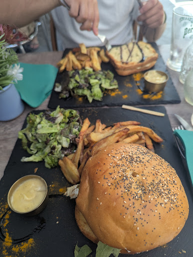 Het was gisteren natuurlijk een erg drukke dag voor de restaurants. Wij hadden een kleintje bii van 9 maanden die rond 6e honger krijgt, dus voor Franse standaard zochten wij al vroeg een plekje op het terras. Ivm met de taal barrière hebben wij 2x gevraagd hoelaat de keuken open gaat zodat wij hier zelf ook wat kunnen eten. Dat was tussen 19:00 en 19:30. Het was toen 18:30, dus besloten wij lekker op het terras de kleine eten te geven en zelf te wachten tot de keuken open ging. Het opwarmen van het baby papje mocht de ober van de baas nier in de magnetron doen, maar de ober was super toen hij ons een bakje gekookt water kwam brengen. Zo konden we het toch opwarmen. Ondertussen hebben we wat van de lokale speciaal biertjes gedronken. Uiteindelijk werd het wat drukker op het teras en kregen de eerste mensen bestek en servetten. En werd er bij ons op tafel ineens een bordje gezet met gereserveerd voor 3p zonder dat er iets werd gezegt. Ondertussen kregen we geen contact met de service. Uiteindelijk kwamen ze toch langs omdat wij de kaart hadden gepakt van de tafel naast ons. Daar wilde mensen zitten voor wat drinken, maar dat mocht niet meer als ze niks zouden eten. De bestelde hamburger was erg lekker. Rood van binnen maar zeker groot genoeg. Friet erbij was ook lekker, alleen de saus in het bakje heeft lang onder een warmte lamp gestaan waardoor de bovenkant helemaal verkleurd was. Tevens hebben wij nooit bestek of servetten gehad, maar gelukkig had ik genoeg babydoekjes bij :). Er liep wel een dame rond met bestek en servetten, maar die zag ons niet helaas.