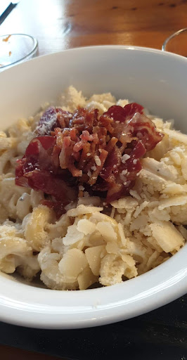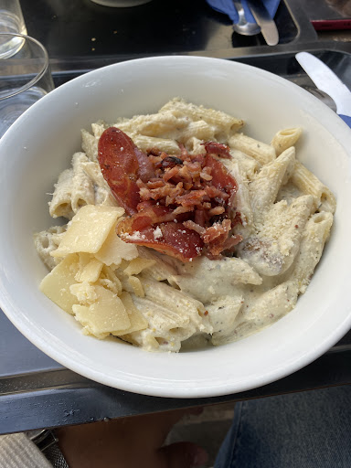 Ristorante accogliente. Personale simpatico. Orari ottimi. Ma se ho messo una sola stella una ragione aimè c é. Se il concept del locale è incentrato sulla pasta...la prima cosa da fare è saper fare la pasta e soprattutto saper la cottura del prodotto che si va a servire. La seconda cosa da fare se sul menù c è il nome di un tipo di pasta è informarsi sulla ricetta di quel determinato piatto e seguirlo quanto piu alla lettera possibile, altrimenti sottolinearne la diversità o la quasi per null'aderenza alla ricetta originaria e specificarne le varianti o le aggiunte ;con suscritto come es. : "la carbonara di Peppone" o con qualcosa di simile ;altrimenti il commensale aspettandosi un piatto e venendogliene servito un altro senza preavviso ha tutto il diritto a rimandare indietro il piatto. Fatte queste premesse , posso iniziare a parlare della mia esperienza. Essendo Italiana ho la presunzione di saper e poter parlare della cottura e composizione di uno dei piatti piu popolari e conosciuti d'Italia, la pasta alla carbonara. Ebbene mi aspettavo di ricevere un piatto di a pasta ALDENTE e con Ovviamente UOVA, soffritto di cipolla e BECON più PARMIGIANO....invece no..mi è stata servita una pasta esageratamente scotta con becon e una SALSA ROSA (panna e pomodoro)! Premettiamo che io aspettandomi una cosa fossi allergica o intollerante al pomodoro o alla panna cosa avrei dovuto fare?! Per non parlare dell indignazione , quasi offesa, che ho provato nei confronti di uno dei piatti più buoni e conosciuti d' Italia. Mi domando il perché di una cosi grave negligenza nel dovere anche solo entrare su google e scrivere : ricetta carbonara e attenersi a seguirla! Perché altrimenti non ne vedo alcun senso! Mi spiace dirlo perché il personale è stato anche amorevole ma non ci...