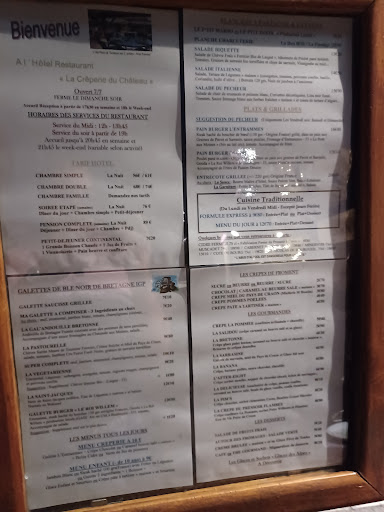 Read moreExpérience décevante pour le restaurant, dans l’ensemble je donne une note basse. J’ai dépensé 72€ pour deux adultes et un petit enfant et cela me paraît excessif surtout que j’ai mal mangé. Tres peu de choix à la carte. La pièce de boucher ne vaut pas les 19€ affiché, la viande n’était pas de grande qualité car sèche. En plus on avait précisé vouloir une cuisson saignante tous les deux, alors qu’on l’a reçu à point. L’accompagnement est trop petit, j’avais demandé des légumes de saison mais j’ai trouvé surtout de l’ognon avec des microscopique courgettes; ainsi la sauce était bonne mais servie dans un microscopique petit bol sur le côté qui n’était pas suffisant. La galette pour l’enfant était correcte ainsi que la glace sans plus. Cela vaut la peine de s’arrêter uniquement si vous n’avez pas d’autre choix ou pas le temps Vous pouvez accepter de manger leur menu du jour à 15€ si vous avez des goûts faciles. En revanche si vous avez des allergies comme nous, ou d’autres préférences, préférez les galettes comme ça vous dépenserez mieux votre argent. Dans l’ensemble leur salle intérieure est jolie, ainsi que la petite terrasse loin de la rue. Le magnifique château privé se trouve juste en face. Pratique mais...
