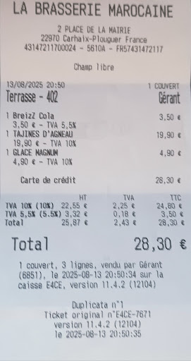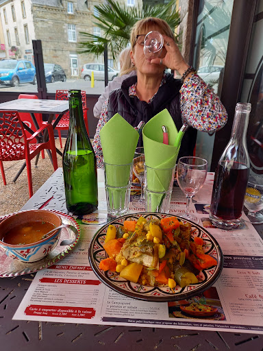 Read moreAprès une agréable journée de retrouvaille avec nos amis bretons nous sommes partis à la recherche d'un restaurant dans les environs de Carhaix-Plouguer. Quelle ne fut pas notre surprise de découvrir qu'un samedi en fin d'après-midi pendant la période estivale (18h00) la plupart des magasins et des restaurants étaient fermés. Après plusieurs échecs et plus d'une heure de recherche infructueuse nous franchissons l'entrée de La Brasserie Marocaine. Nous demandons au Chef s'ils ont des places de disponibles pour deux couples et leurs enfants, ce dernier nous répond poliment qu'ils sont complets. Nous ressortons donc sous la pluie et recherchons à nouveau sur nos téléphone portables. La patronne revient nous voir et nous dis qu'elle peut nous accueillir à condition que nous soyons partis dans 45 minutes car un groupe va arriver. Nous avons accepté avec gratitude et avons été installé dans une alcôve à cet effet. Malgré les circonstances l'équipe s'est montré aux petits soins avec nous, le chef nous a fait rire avec son humour désopilant! Après le passage de notre commande la patronne est venue avec un large sourire nous signaler que nous pouvions prendre notre temps car le groupe prévu aurait de retard :-) Nous avons donc passer un excellent moment sur place et tous les plats étaient somptueux! Nos amis (revenant de leur premier séjour au Maroc) et nous étions unanimes, ce furent les meilleurs couscous et tajines que nous n'ayons jamais mangés! Une mention spécial pour les merguez, elles sont incroyables! Et le bouillon...une pure merveille! Bref nous recommandons chaleureusement La brasserie Marocaine, pas seulement pour le plaisir des papilles mais aussi pour la gentillesse de la patronne et l'humour du chef! Au plaisir de...