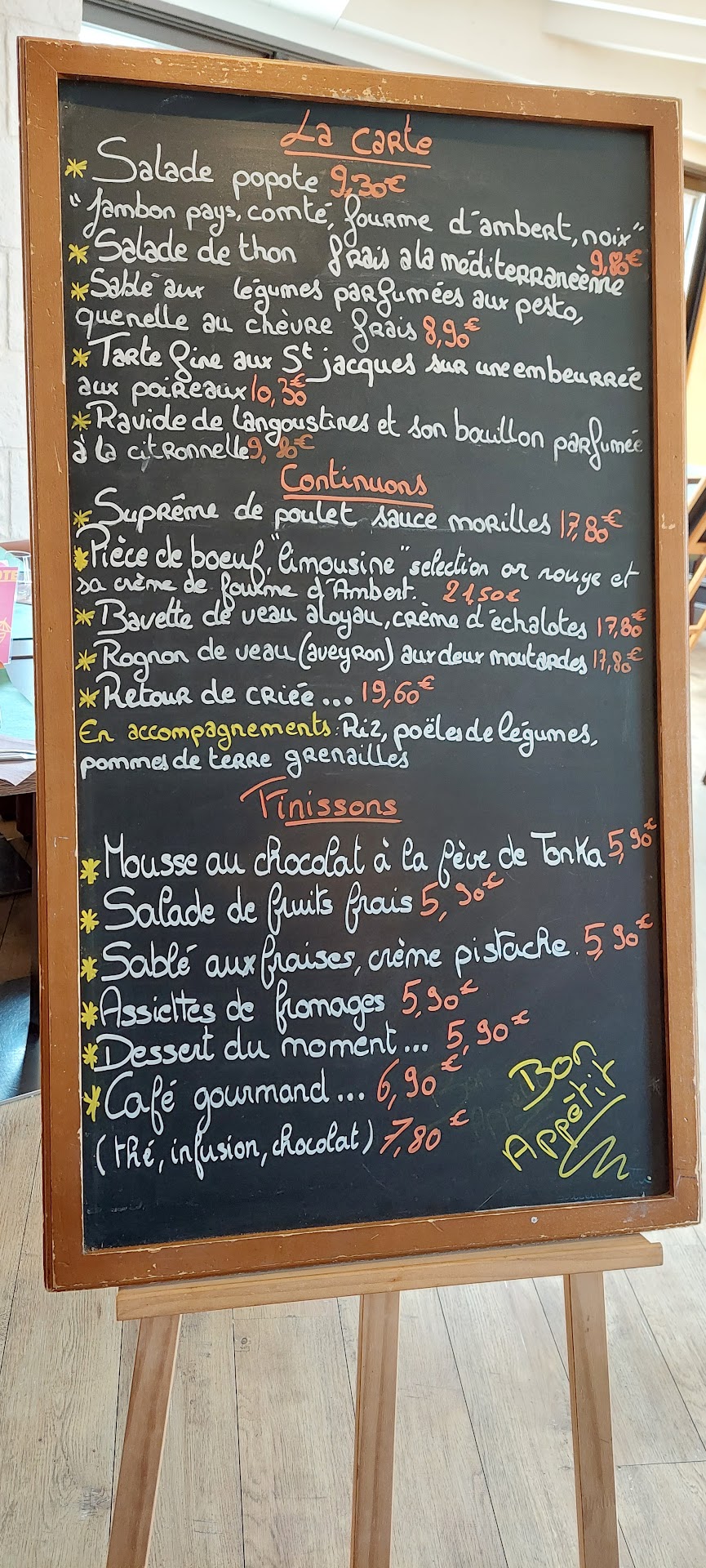 Il y a UNE ardoise qui tourne pour chaque table concernant la formule du samedi soir. Pour la carte, amenez vos lunettes si vous êtes trop loin des deux cartes (placarder sur le mur du restaurant)