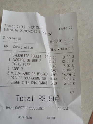 Be carefull with this tricky restaurant when you are a tourist. You ask for the homewine and then he asks which?A Bourgogne or Rhone. He does not show the bottle and not the menu with pricelist. Afterwards he counts what he wants. A small piece of brochette poulet € 19,00 Tatare de boeuf from an old cow of about 150 grs €22,00. 1 single glas of wine € 5,50. Normal...