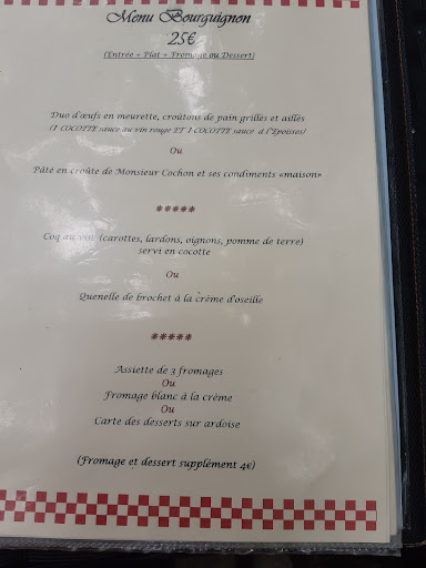 Au menu pour 25 euros, nous avons opté pour le duo d'œufs meurette (dont un très original à la sauce à l'époisses, une tuerie !), une grande cocotte pour deux de coq au vin et ses légumes et ses desserts maisons. La carte des vins est large et même si vous optez pour le pichet de 50 cl à 24 euros, se sont les crus locaux qui vous sont proposés : Mercurey, Givry ou autre Santenay 2019. L'accueil est aussi agréable que les portions sont généreuses et si vous souhaitez connaître des anecdotes sur le château voisin, n'hésitez pas à les demander au propriétaire du Petit Blanc, il connaît très bien les lieux ;-) Juste un petit axe d'amélioration qui m'empêche de lui décerner les 5 étoiles : Le chocolat qui nappait les profiteroles n'était pas chaud ou tiède comme le veut la tradition, mais ça ne nous empêchera pas de revenir car l'adresse est fort gourmande et...