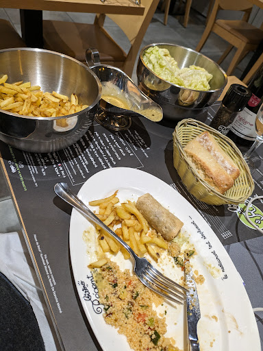 Read moreQuelle déception. Ma faute . Si j'avais su que c'était une chaîne... Alors que je vais dans une petite ville de province au coeur des vignobles. J'aurai aimé une cuisine locale et des vins du coin. Si vous voulez du végétal. Il y a un plat. Nems de légumes. Très gras. Peu de légumes mais surtout du riz en abondance a l'intérieur. Et pour accompagner un taboulé. Froid normal. Mais bon en plein hiver... Et sans goût. A se demander si ce n'est pas du taboulé industriel. Autre accompagnement. Les.frites. pas sûr qu'elles soient maison . Ni bonnes ni mauvaises. Mais a volonté... A quoi ça sert ? Servir tout un saladier alors que je suis seul. Mais bon sang je lutte tous les jours contre le gaspillage alimentaire. Et là on te gave. Impossible de finir j'ai du manger la moitié a peine. Idem la salade. Un saladier plein. Impossible à finir. Je ne prendrais pas de dessert. Le vin. Ici a Chalon j'espérai un vin sympa. Le seul du coin est un pinot noir tres basique. Ah oui . Et servi déjà ouvert. Sans me le faire goûter... Rien a dire sur le service. Propreté... Ce n'est pas chaleureux. Ça doit être...