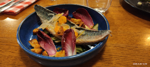 Read moreRepas à 4 ce jour, menu à 26€ (entrée plat dessert) nous avons été accueilli par un serveur et une serveuse avec beaucoup de professionnalisme, le menu nous a été très bien détaillé. Nous avons pris œuf meurette en entrée. La sauce était très bonne, très bien assaisonner et n’était pas acide ni trop aillée, nous avons choisi ensuite les onglets de bœuf. Les cuissons ont été respectées. La viande était chaude, les accompagnements très bien présentés et excellents, note spéciale pour le beurre aux anchois, une première pour moi et une belle surprise. Les desserts, une pure merveille du fait Maison une pomme rôti et sa crème fouettée, caramel, beurre, salé, juste ce qu’il faut, et plutôt léger, pas du tout Bourratif. Le restaurant est situé dans une petite rue piétonne, le cadre en pierres est très sympathique bien aménagé la décoration sobre. Les toilettes sont propres mais ne reflètent pas le cadre du restaurant. Point d’honneur à la cuisine du chef. Nous avons passé un agréable moment et nous avons...