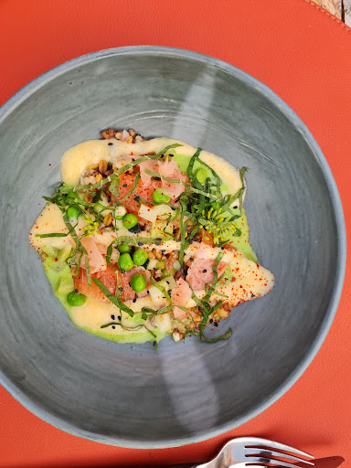 Après avoir entendu beaucoup d'éloges sur ce restaurant, je suis allée déjeuner avec ma maman un dimanche. Ayant travaillé dans la restauration, je suis consciente que nous ne sommes pas des clientes de rêve : nous ne buvons pas et ma maman d'un certain âge a un petit appétit. Accueil un peu froid qui devient glacial lorsque nous refusons un apéritif. “Vous ne boirez même pas avec le repas?” Et non… « même pas… » Ensuite on nous lit le menu entrée, plat, dessert comme s’il s’agissait d’un restaurant Michelin. Sûrement dans le but d’impressionner les clients avec des mots comme « gel » ou « Ottolenghi ». Deuxième coup dur: le menu à choix unique ne convient pas pour des raisons d’intolérances, nous commanderons ainsi un menu et des tapas sous le regard méprisant de notre serveuse. Précision: le restaurant était presque vide, nous ne prenions donc pas la place de "bons" clients. Les fameuses tapas et l’entrée arrivent: de l'hummus recouvert de couches d'huiles multicolores (je doute qu’il s’agisse d’huile d’olive) et du sel aux algues donnant un goût de poisson. De la burrata sèche baignant dans de l’huile avec quelques tomates cerises coupées en 2. L’entrée : une madeleine de 3 cm avec du choux cru et un “pickles” de nectarine qui ne se mariaient ni avec la madeleine ni avec le choux cru. Ensuite le plat: un filet de saumon à cuisson indéterminée, peut-être au micro-onde, servi avec une boule de riz cru… pas croustillant, pas al dente, cru. Ce riz n’était pas passé dans une casserole. Et une flaque d’huile sur le côté avec 2 pignons et un semblant d’herbes, probablement la fameuse sauce « Ottolenghi ». Et enfin le dessert: une prune crue coupée en 4 avec une cuillère à soupe de glace au pop corn fondue et 3 pop corn mous…. Comme rien dans le menu ne demandait la moindre cuisine, il se peut qu’on n’ait pas eu de chance et que le chef ait été absent. Mais même si le repas avait été délicieux, cela n’aurait pas compensé l’accueil. Encore un de ces restos effet de mode pour les clients naïfs qui se laissent facilement impressionner. La terrasse...
