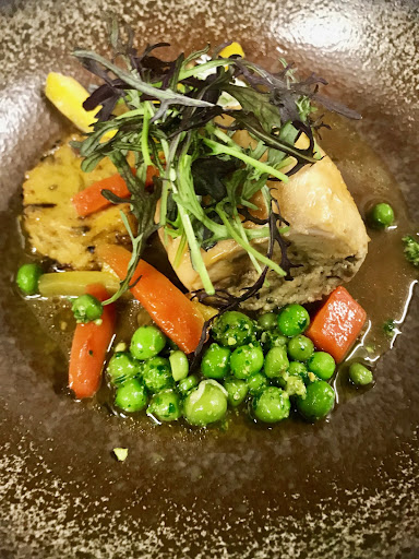 J'ai pris la volaille aux petits pois frais accompagnée de pesto ail des ours et de moutarde métisse : un pur délice ! L’île flottante à la crème de fraises a été une excellente surprise !