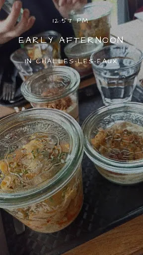 Read moreConcept original d'être servi dans des bocaux en verre et surtout l'originalité des menus quotidiens. Chez les Filles on peut petit déjeuner, déjeuner, goûter ou prendre simplement une pause boissons. Prix très raisonnables vue la qualité de fraîcheur des plats quotidiens proposés et tout est fait Maison : soupes, entrées froides ou chaudes, wraps chauds ou froids, salades, plats divers avec viande ou poisson, crustacés et légumes frais et féculents, les desserts "une tuerie", salade de fruits Maison aussi, fromages frais avec divers toppings. Les cookies et autres en-cas sont faits maison...Vous serez très bien accueilli avec le sourire et guider pour découvrir ce concept. N'hésitez pas à connaître le menu du jour sur le site ou le Facebook "Chez les filles". Venez et essayez ce bistrot & coffee original à Challes les Eaux en face du Médipole de Savoie. Vous pouvez aussi réserver vos plats à l'avance. Pas de livraison disponible. BON APPÉTIT...