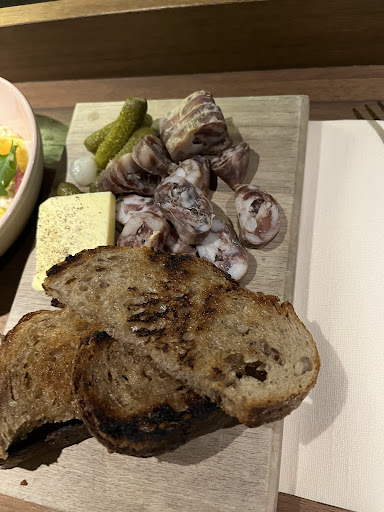 Read moreSURCOTÉ !! J'apporterai un avis plus mitigé aux vues des commentaires élogieux que j'ai pu lire ici.... Le service est bon. Les serveuses sont rapides et souriantes ( il serait toutefois mieux d'apporter la bouteille de vin avant ou en même temps que le plat . Cela éviterai de l'avoir pour le dessert) . La terrasse est en bord de route pas très passante mais quand les grosses cylindrées s'y arrêtent il faut parler plus fort . Elle est aussi légèrement en pente avec des tables et chaises bancales on a l'impression d'être au camping. Les tapas avec l'apéro. Je valide. C'était bon et c'est une bonne idée. Le ris de veau très moyen . Trop gras, trop frit et a 35€ j'aurais aimé en avoir un peu plus dans l'assiette. D'ailleurs ! L'accompagnement, une bonne purée légère et onctueuse mais en quantité ridicule. On a précisément compter 5 cuillères a soupe pour 2 personnes... Le fondant au chocolat est fait maison et ça c'est suffisamment rare pour le souligné. Je n'ai pas du tout aimé les toilettes avec des urinoirs dans les mêmes WC que celui des femmes. Autant pissé au bord de la route !!! On es parti dans les derniers, il restait plus que nous sur la terrasse et on eu le droit a une petite salve de grossièreté de la part d'une des serveuses face a un parasol récalcitrant. On fini en beauté ! Bref ! Je fais des restaurants tous les jours... il existe des restaurants ( même a Val d'Isère) a 17€ le menus ou j'ai mieux mangé. Nous avons payé 234€ pour 4 personnes... CQFD ! Allez courage et redescendez de...