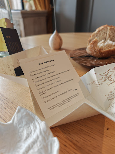 Went for dinner with 2 on a Thursday night. The beginning was a little rough, we were placed but our jackets were not taken, they were akwardly hanging over our chairs. Other tables had a small “chair” for their handbags, which we didnt get, so the small bag we had with us was hanging over the chair as well. The menu was presented in a small paper envelope, the idea was nice, but was not well executed. The papers were unevenly cut, and written only in French. Through this way we could not understand the, i presume, information about the restaurant and menu.