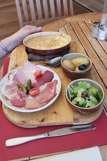 Au niveau des plats: Les fondues sont bonnes mais parmi les 2 fondues dégustées la fondue aux cèpes était la meilleure car cela se marie bien. Le saint Marcelin n’apporte pas grand chose et ne se sent pas assez dans la fondue à notre avis. La charcuterie n’est pas comprise dans le prix. J’ai également goûté la truite rose sauce beurre citron avec des frites. La truite était bien cuite et avait bon goût. La sauce beurre citron accompagne très bien la truite. Les frites étaient bonnes mais selon moi elles étaient surgelés et pas maison.