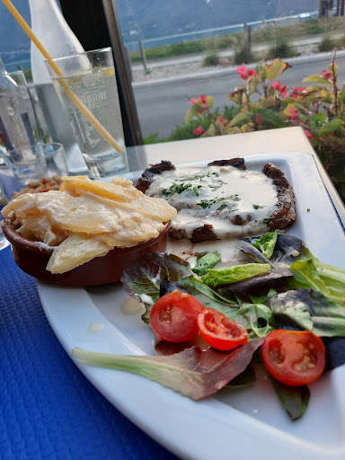 Read moreRestaurant au bord de la route donc très bruyant même si belle vue sur le lac et la montagne En plein soleil à midi On vous propose le store à la fin du repas Concernant la nourriture aucune info à l’extérieur du restaurant concernant le plat du jour concerné par le menu
