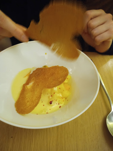 Read moreNous avons remarqué un heureux changement de décor, plus coloré avec du moderne dans l'ancien, c'est une belle réalisation. Les plats sont encore plus beaux avec plus de variations. Il y a une possibilité d'avoir du poisson dans le premier menu ( une trentaine d'euros pour une entrée, un plat et un dessert). En suggestion, un plat végétarien serait sûrement apprécié... Un menu du jour à 35 euros celui du dessus à 59 euros ( avec plus de possibilités mais avec souvent des suppléments me semble un peu cher ) On retrouve l'œuf mi chaud mi froid, le capuccino de purée au chocolat et on se laisse surprendre par les nombreuses saveurs et textures. Le serveur est discret et prévenant et répond avec plaisir à nos questions. Nous avons passé un moment agréable et nous y...