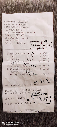 Passez votre chemin ! Je mange chinois depuis 30 ans en déplacement et c'est un des plus mauvais. Plats Très très moyens. Sur place hygiène douteuse qui me fait réfléchir ... Je laisse une chance. On me fait attendre 15 minutes assise à une table salle, pleines de miettes du repas des employés et de liquide. Il n'y a qu'une table occupée par des clients. Le patron ne fait rien ! Il regarde l'employé courir partout et fait les 100 pas et me souris. Il laisse tout, dégoûtant, tel quel. Ça ne lui pose pas de problème. La table à côté est aussi pleine de traces de graisse. La carte menu qu'on me tend est pleine de graisse... Seuls les nems au porc sont délicieux et très gros et le riz cantonnais est presque normal car le riz n'est même pas sauté. C'est le seul point positif. Légumes sautés Shop Shué (sorry pour l'orthographe) pas bons du tout, dans une sauce marron coupée à l'eau... avec des carottes en rondelles (ça n'existe pas comme ça normalement, des endives.. il n'y en a jamais ds la cuisine chinoise). Les crevettes sauces aigre douce, n'en sont pas.. Elles baignent ds la même sauce marron des légumes de l'autre plat, sauce tjre coupée à l'eau, au lieu de la sauce un peu collante orangée. Bref,...