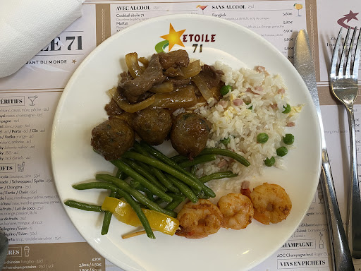 Comme cité dans un autre avis pour un restaurant asiatique, je suis un SPÉCIALISTE des restaurants asiatiques, je ne vais que chez eux, je SQUATTE chez eux : choix, prix, ambiance, sourire. L'Étoile 71 est un de nos restaurants préférés où nous aimons aller tous les mois avec ma femme et notre fille de 3 ans. Comme expliqué auparavant, une décoration de ce type de lieux coûte minimum 1 million d'euros à la création, ici, c'est déjà super, et elle va encore être changée pour plus majestueux dans les prochains mois, après renseignement auprès du patron alors que je le complimentais. Il y a beaucoup de choix, et malgré que nous ne soyons pas dans une grande ville, les buffets sont bien garnis.