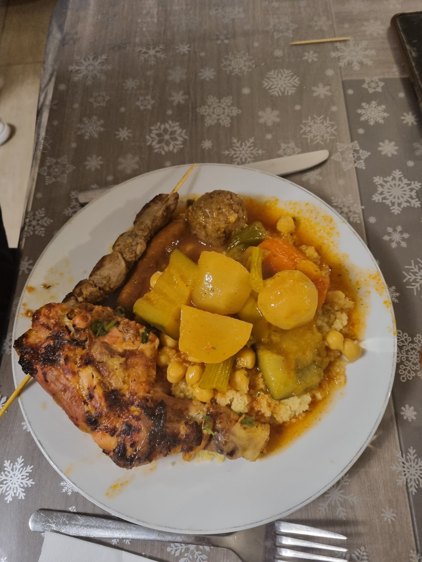 Ali est très accueillant et sincèrement gentil et bienveillant. Quant au couscous 😋👌🏻👍🏻👍🏻👍🏻, semoule fine et légère, viandes de qualité et parfaitement cuites, cuisson des légumes d'une justesse idéale (ni trop fondants ni trop croquants), sauce impeccable (du goût et pas trop grasse). Malgré 4 gourmandes à table, impossible de tout finir. J'ai demandé s'il était possible de partir avec ce qui restait... oui, sans aucun problème. Et en plus, Ali a rajouté un peu de semoule et quelques courgettes et navets car selon lui "les carottes n'aiment pas être toute seules" 😆🥰. Vraiment parfait tout ça! Et le prix est plus que...