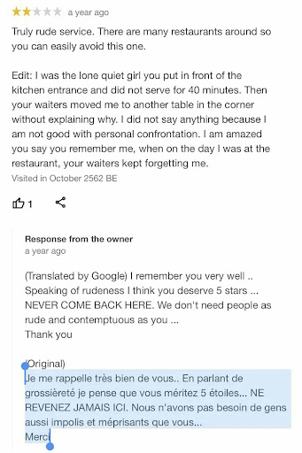 Read moreMaybe your serving good meals, absolutely you have poor customer service. specially after what this lady face in your restaurant, you did it twice in person and again in this review section, you were negatively impulsive and you even asked her to "never come back" that was rude, cruel and brutal. knowing the fact you serve food and food usually comes with love and respect, specially when it's from france, but you bring a whole different experience to the tourists of the world, I'm sure people will find alternatives to...