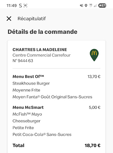Petit avis d'un fidèle client depuis l'ouverture en l'an...!!! Très très mécontent !!! Résumé du mécontentement : Aujourd'hui jour de fête des pères, commande via l'application. Pas de soucis hormis que les salades ne sont pas sur l'application donc obligé de recommander sur place !!! (D'après le responsable en chemise bleue qui m'a reçu cela fait plusieurs mois que ça dure et apparemment c'est normal !!! ) ou du moins ça les perturbe pas que je sois obligé de recommander !!! ( perte de temps pour tout le monde !!! En ce qui concerne le repas : Services rapide mais avant d'être servi je précise au responsable qui me sert vu que j'ai du lui commander la salade de faire un effort sur la quantité des frites car depuis le nouveau packagin pour la planète j'ai la forte impression que je mange beaucoup moins de frites qu'avec l'ancien packagin en papier. Très clairement à chaque fois que je mange sur place je redemande des frites. Et bien comme d'habitude malgré ma demande les frites ne ressemblent pas aux photos que je vois partout!!! Je ne vois pas pour autant que les prix ont baissé !!! Je retourne donc voir ce responsable qui me répond que pour lui c'est la quantité normale. Mais il arrive quand même à en remettre suite à ma demande. (C'est bien qui reste de la place dans le contenant plastique) Malgré mon fort mécontentement ce responsable est resté courtois. De plus S.V.P faites un effort sur les livres dans les happy meal nous venons environ toutes les 2 semaines et toujours les mêmes livres même en demandant au comptoir un échange !!! (quelle frustration pour les enfants qui aiment encore lire). Il serait grand temps de réagir !!! On parle de McDonald's et pas d'un petit fast food isolé !!! Je joins les photos suite à mes...