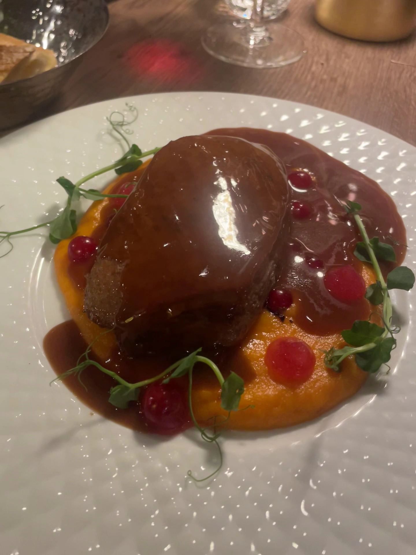 Le bœuf était savoureux, la cuisson maîtrisée et la pièce trèeees généreuse. Un moins bien pour la sauce au foie gras qui était timide en foie gras. Les churros furent une belle découverte qui pourraient être plus nets du point de vue réalisation technique (calibre identique et forme nette). Le tout était super 👍 avec quelques améliorations à envisager pour que ce soit absolument parfait. On s’est, tout de même, régalé! Les fromages, de la ferme Sainte Suzanne sont variés et sont servis avec des condiments de fruits. Ce sont des fromages avec du caractère qui ne conviendraient pas aux amateurs de fromages légers. Pour moi la puissance était satisfaisante. Les desserts sont généreux et bien exécutés de manière élégante. La sphère mériterait un ajustement d’acidité qui n’est pas suffisamment présente dans la préparation. Le chocolat blanc et l’insert pistache donnent une rondeur prépondérante manquant de peps. Le yuzu est bienvenue mais est à l’extérieur. L’ensemble reste intéressant et le biscuit en base amène le croquant. Quant au profiterole stracciatella, il est fidèle à ce qui est attendu, généreux voire copieux et peu sucré. Une belle note en fin de repas.
