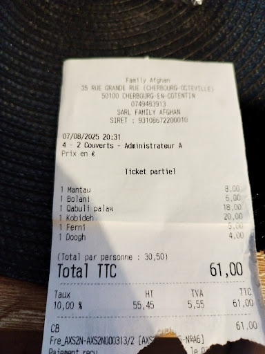 TrĂšs bonne surprise que ce restaurant trouvĂ© par hasard en se promenant dans les rues de Cherbourg. Le jeune serveur est d'une gentillesse et d'une politesse rare. Il prend le temps de nous dĂ©tailler les diffĂ©rents plats Ă la carte, en nous avertissant quand il s'agissait de plats piquants. Une fois les plats servis, ce fĂ»t un vĂ©ritable bonheur. Des plats savoureux, et servis en quantitĂ©. AprĂšs avoir fĂ©licitĂ© le serveur pour la qualitĂ© des plats, il nous a informĂ© que c'Ă©tait sa mĂšre qui cuisinait tout "maison", et ça se sent. Le restaurant porte bien son nom, on y mange comme si on Ă©tait accueilli dans sa famille. Un seul petit point qui pourrait ĂȘtre amĂ©liorĂ© : le pain servi Ă table Ă©tait du pain "français". J'aurais aimĂ© avoir du pain afghan pour que la dĂ©couverte gustative soit complĂšte. J'y retournerai avec grand plaisir la prochaine fois que je viendrai Ă Cherbourg. Ă noter que pendant que nous mangions, j'ai vu beaucoup de gens Ă l'extĂ©rieur du restaurant regarder la carte, hĂ©siter, puis finalement continuer leur route. Javais envie de sortir pour leur dire de revenir car ils Ă©taient en train de rater l'occasion de dĂ©couvrir un...