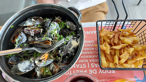 Un bon accueil, personnel aimable, cadre agréable, voici pour le côté positif. Des propositions de repas sont affichés sur un tableau (moules/frites avec différentes déclinaisons de sauces), et de la viande grillée, alors qu'il y a une autre carte (présentée au moments des desserts avec des plats bien alléchants comme du Saumon de Cherbourg, ou des brochettes de poisson marinées. Les moules (annoncées de Dunkerque) sont loin d'être au top, trop cuites, beaucoup n'étaient pas bonnes (goût horrible), rabougries, coquilles cassées ??? . Les frites acceptables mais surprenant de voir poser directement sur le set de table le petit panier de frites, il y a plus de sel qui va sur la table que sur les frites, au moment de l'assaisonnement. Le service expédié, l'apéritif servi avec des petits gâteaux (appréciés) et avant d'avoir terminé l'apéro, on nous apporte le verre de vin blanc et les moules. On nous explique que pour des raisons de service (gestion du personnel) arrêt en cuisine à 21h. L'établissement possède 2 salles de restauration, dans la première salle les tables étaient dressées... pour le lendemain. Nous étions dans la 2ème salle (véranda) où étaient installés des convives fort bruyants, peu respectueux des autres convives (et ce n'était pas de la jeunesse !!!), conversation salace (le propriétaire n'en est pas responsable), mais n'a rien été fait pour leur demander plus de discrétion. Ce groupe fêtait un anniversaire, et nous pensons que ce groupe connaissait la serveuse/propriétaire. Pour conclure, pas prêts d'y retourner !! dommage nous habitons tout à côté. Peut-être pour un verre, mais ce n'est pas pour...