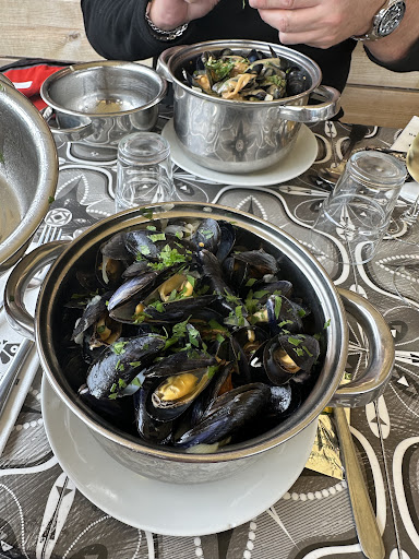 De passage nous sommes arrêtés pour manger moules frites, personnel accueillant lors de notre arrivée. Vite débordé quand plusieurs clients arrivent, nous n’avons pas eu notre carafe d’eau demandé lors de la commande. 2 Moules frites et 2 verres de vin 48€, je trouve que cela fait excessif pour de simples moules… Nous avons patienter 15 min après avoir finit mais personne n’est venu nous débarrasser , ou demander si nous souhaitions dessert ou café. Je suis allé moi même demander et régler la note au comptoir (nous étions 2 clients à attendre, j’ai discuter avec le monsieur qui lui aussi a attendu 15 min avant d’être débarrasser et n’a finalement pas pris de dessert à cause de l’attente ) avant de pouvoir régler il a fallu encore attendre que la dame termine de débarrasser et dresser des tables avant de nous encaisser. Je peux comprendre que d’être 2 c’est compliqué mais dans ce cas demander aux nouveaux clients de patienter un peu ou de revenir sachant qu’après il es difficile de s’occuper de tous les clients , cela évitera que les clients actuels patiente trop et partent sans dessert. Dommage car très beau cadre, et belle terrasse couverte et fermée. À revoir au niveau de l’organisation et du nombre...