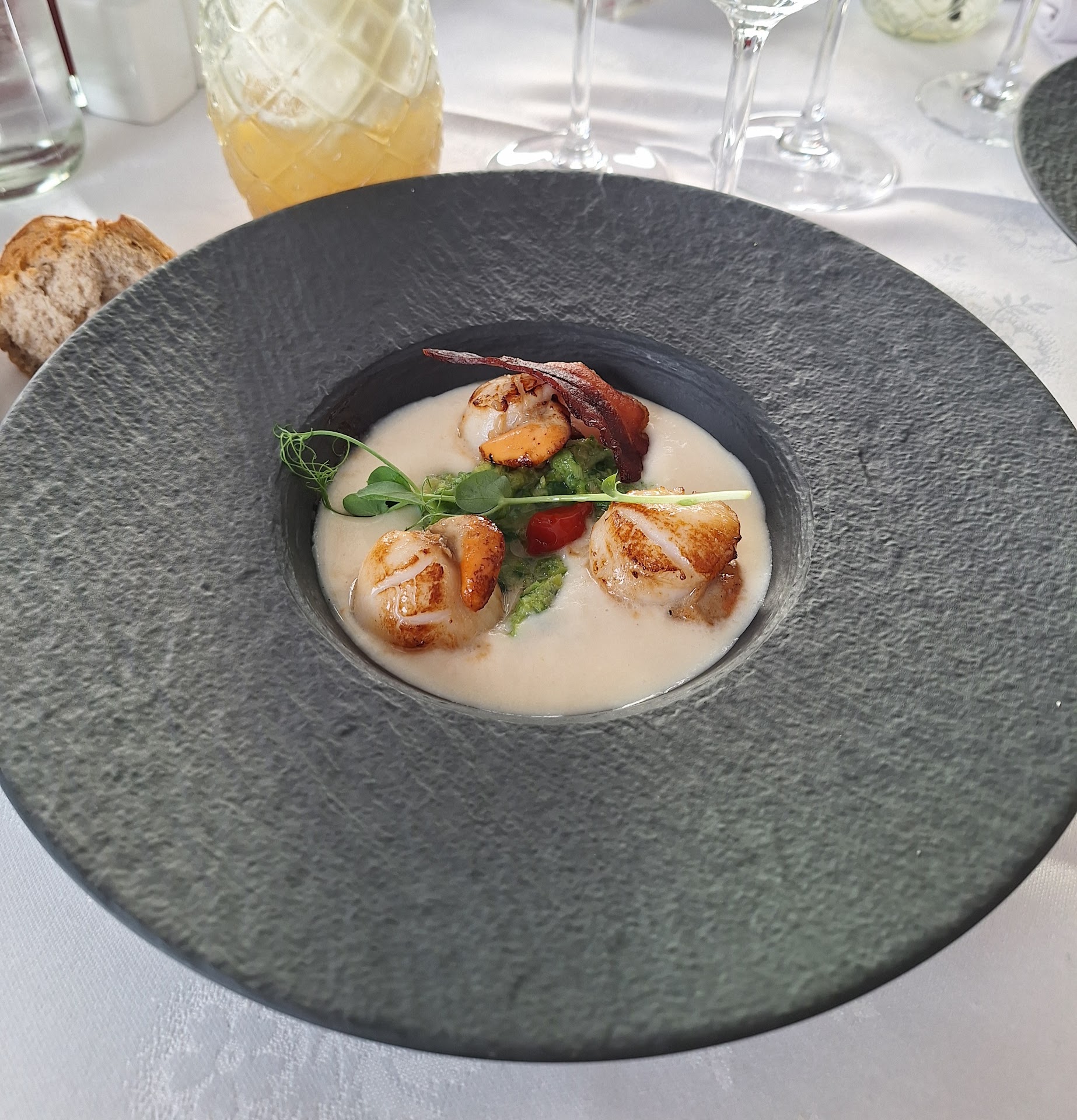 Restauration : Entrée - (+) convenable heureusement les saint Jacques et tagliatelles de céleris relevait la note, ainsi que le foie gras et marmelade de clémentine.