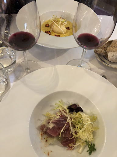 fossê Saint Ange (wings of an angel) Myriams menu always surprises and gets the taste buds worked up. She has childhood travel connection to the Far East & beyond which she weaves into her exquisite dishes (all locally-sourced-products). I had fois -gras & quince as my starter & the lamb tagine styled dish as my main. This was on a generous bed of authentic styled Moroccan couscous which was delicious - the lamb was tender - adequately moist and spiced to compliment the couscous which hit memories of my last trip to Marrakesh . It was Perfect fuel food for a cold evening in central France. Mark enjoyed the burrata starter which was served on a portion of lightly spiced cooked pears which took a simple dish to another level of deliciousness. His main of Mushroom ravioli was homemade packets of Italian magic - another generation portion which he couldn’t finish but took home as he couldn’t fathom wasting it . A bottle of local “domaine de noble “ was perfect to help re-hydrating and keep the conversation flowing - this place never fails to impress . Combined with service by lovely Corrine (who speaks English) gives this place a 5...