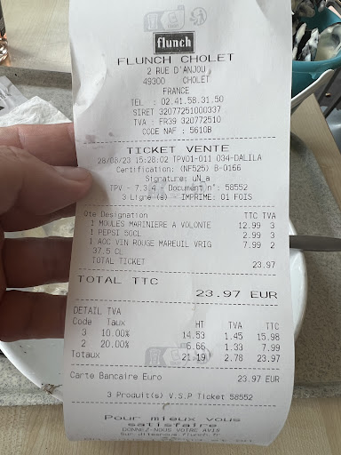 Read moreCela fait Quelques années que je viens manger dans ce Flunch, mais plus j'y retourne et plus je suis déçu... les prix des plats augmente mais la qualité du service et des plats ce dégrade. nous somme des habituées du double rösti burger, donc comme d'habitude un midi en décembre nous commandons notre plat. il est servis avec les rösti congeler et les viande beaucoup trop cuite alors qu'on avait demander saignante. Nous retournons voir la fille au grill qui nous refait le burger , manque de Pot .... encore une fois elle cuit trop la viande et pas les rösti.... après avoir quasiment rien manger nous somme aller voir un des responsables pour lui faire remonter l'information. Très sympathique il s'excuse et nous offre 2 rösti burger pour une prochaine fois. Fin décembre nous décidons donc de retenter l'experience, manque de pot la meme fille est au grill et c'est encore une fois désastreux ! cela nous refroidie d'aller au Flunch. Cette semaine nous sommes retourner pour la premiere fois depuis des mois, nous regardons c'est pas la fille au grill ! nous commandons donc nos burgers, cette fois ci mieux cuit et mangeable. et le service très agréable d'un monsieur. nous décidons donc de prendre une crepe pour finir notre repas... Manque de pot revoilà la meme serveuse qu'en décembre ... elle nous fait un carnage au crepes, une vingtaine de minutes, au moins 5 crepes à la poubelle et la manager qui viens en renfort nous pouvons enfin finir notre repas. Flunch à Eviter si cette serveuse vous fait a manger, ça sera long et...