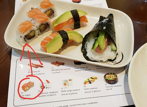 L'attente se fait long presque 21h, pourtant la commande était légère. Les produits chauds qui était en légère quantité son malgré tout arrivé rapidement, l'objectif d'un repas à trois et quand même de manger à trois et pas tout seul au vu de l'attente qu'on a eu sur le premier "round". On demande gentiment à une serveuse si notre commande est bien en cours de traitement, elle n'a pas su nous répondre et n'ai pas revenu, une collègue à elle est venu vers les 21h15 pour nous donner ENFIN nos maki, sushi, yakitori (90% de la première commande). On remarque déjà un soucis, ils manquaient 1/4 de notre commande. Nous le faisons remarquer à une serveuse assez gentiment malgré la frustration.