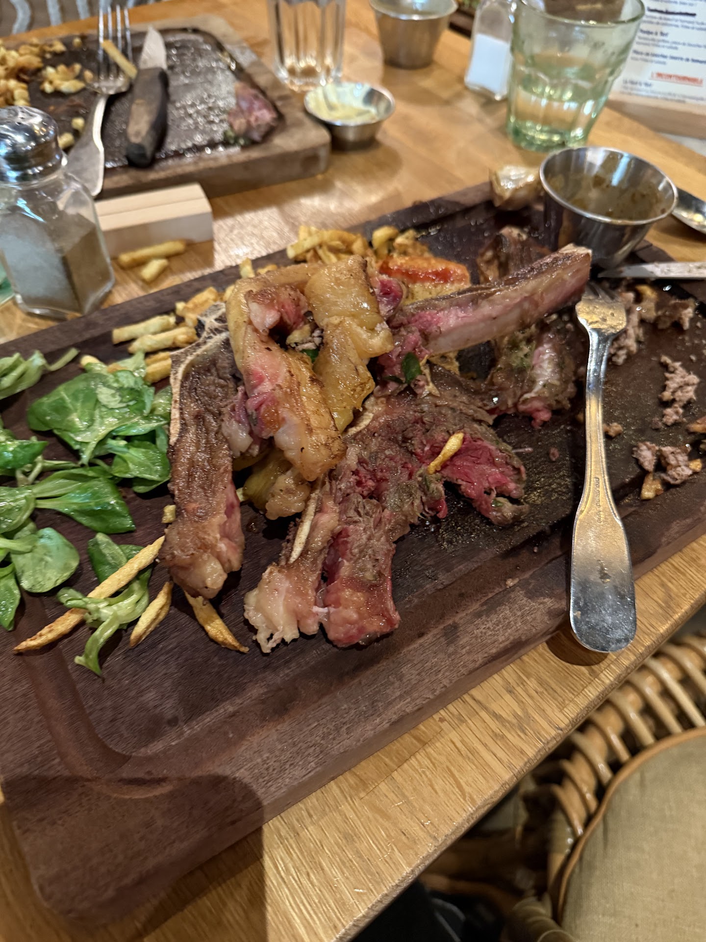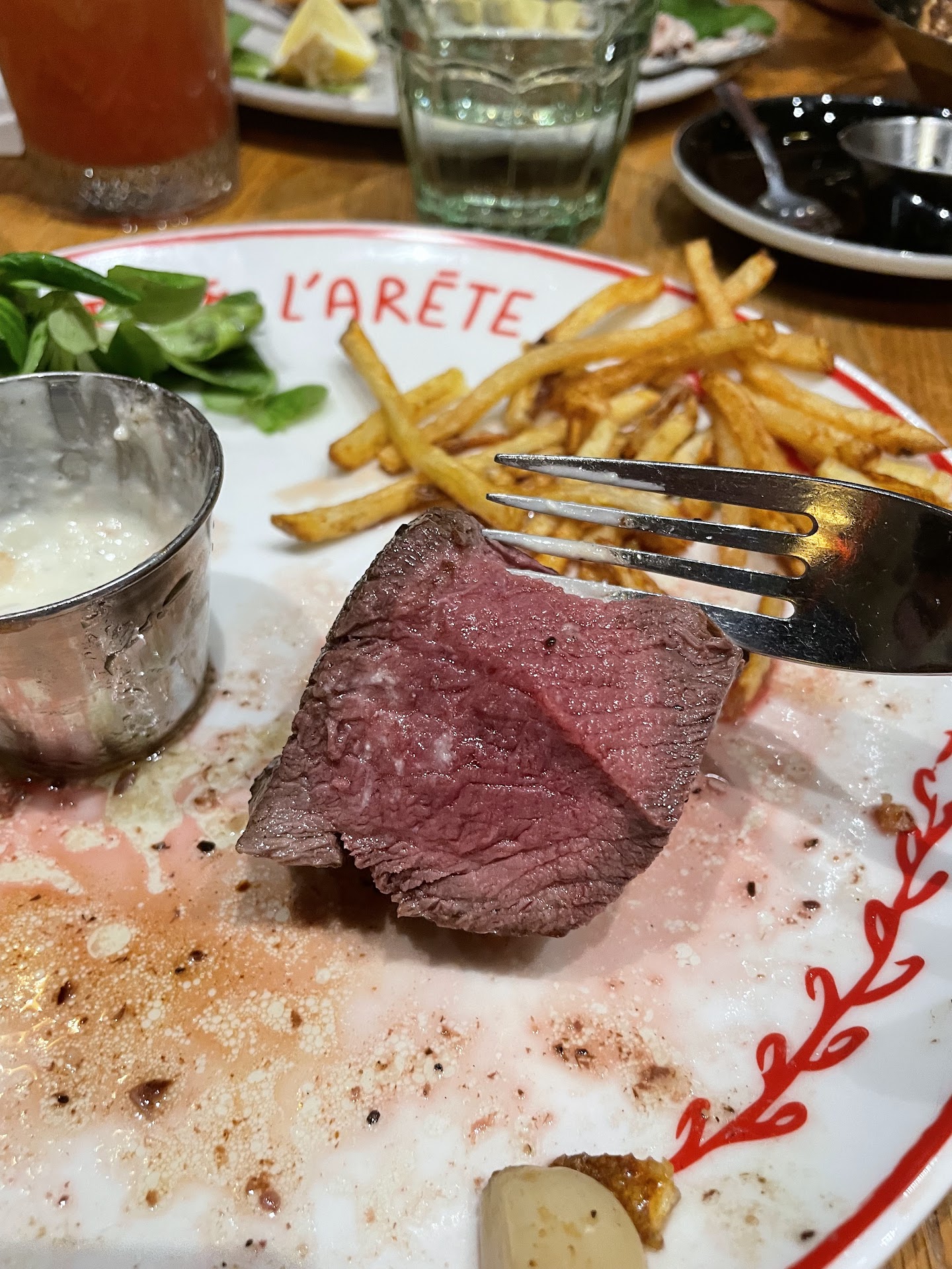 Un cocktail "Vas-y Francky" très très bon . Texture et dosage en alcool parfait . Bravo ! Accompagné de sa tapenade ... et de l'entrée que j'ai dû renvoyer (un des effets du COVID, on ne sait plus servir dans les restaurants français, on vous amène l'entrée avec l'apéro, et on vous explique que c'est normal de surcroît) . Une fois mon apéro terminé, et mon entrée servie au bon moment cette fois, j'ai pu apprécier la qualité des chipirons . Vraiment très très bons . Moins aimé la sauce tartare en revanche, qui en dénature le goût, heureusement servie à part . Ensuite une araignée de porc sauce chimichurri . La viande probablement bonne, malheureusement gâchée, car badigeonnée avec un ersatz de sauce chimichurri . Impossible d'en définir la composition . L'ail, pour sûr . Par contre, j'ai l'impression qu'il a été mis de la roquette (ou de la mâche), en lieu et place du persil dans la sauce (le commis a-t-il oublié d'acheter du persil ?), de l'huile de colza (jaune), et basta (où sont vinaigre ou citron, piment, oignons ou échalottes, etc ? Où est la gourmandise ?) ... Bref une sorte de purée de verdure à l'ail, qui n'a aucune autre fonction que de gâcher la viande . Les frites allumettes, quand à elles, n'apportent rien au plat . Dans un restaurant qui se dit "à viande" (et la vue de la carte le confirme), les clients sont donc de potentiels "viandards" ... Si la viande est de qualité, et c'est bien l'impression que j'ai, elle doit se suffire à elle-même . Laissez aux gens le choix d'appliquer leur sauce ou pas (surtout si cette dernière est râtée) . Une brioche façon pain perdu ... Trop épais à mon goût (7-8 cm), on a l'impression de manger notre brioche du matin juste sortie du grille-pain . Ça impressionne, c'est tape-à-l'œil, mais ça n'est pas gourmand . Faîtes-en 2 tranches, la cuisson sera plus facile à maîtriser entre le saisi et le moelleux . Le topping caramel beurre salé est horriblement sucré . Le prix, normal en regard de la carte .