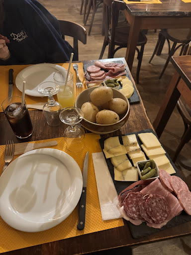 Read moreNous avons réservé une table pour 2 adulte et 2 enfants dont une pousette préciser sur la réservation. La dame très gentille nous accueille avec le sourire, mais surprise la pousette ne passe pas dans l'entrée obliger avec mon mari de la soulever à hauteur d'homme (pas d'accès fauteuil du coup). Nous commandons raclette pour notre fils mon mari une truffade et moi un camembert rôti.. La patronne qui fesait le service arrive avec un mignon petit appareil à raclette pour notre fils c'était super sympa il a adoré. Mon mari a apprécié son repas mais une deuxième tranche de jambon pour une truffade aurait été apprécié. Et moi bin du coup super déçu... camembert rôti pas rôti pour le coup je demande à ce qu'il sois réchauffer il a été mis au micro onde quelque seconde il était chaud mais pas fondu.. je pense qu'il a été mis au four trop froid et pas assez longtemps ce qui lui a donner cet aspect pas fondu du tout dommage.. ensuite vien le dessert nous prenons une mousse au chocolat simple et efficace.. La mousse arrive dans deux jolie verre à pied mais à l'intérieur la mousse était granuleuse et un gros bloc de "chocolat" dur au milieu.. j'étais trop triste de ne pas finir ce repas sur un bon dessert. La serveuse nous explique qu'elle fait elle même la mousse et que le chocolat n'avait pas fondu... elle m'offre donc la mousse au chocolat... pour quitter notre table un nouveau problème se dresse devant nous... La table sur le trajet vers la porte fêtais un anniversaire et les gens etaient en plein débalage de cadeaux...Il aurait fallu qu'on les fasses tous déplacer ce qui aurait été gênant pour tout le monde... Nous avons donc demander à sorti par une autre porte si possible?. Me voilà à porter la pousette dans des escaliers interminable sans rampe... je ne renouvellerai pas ma visite dommage... peut être pour une fondu mais...