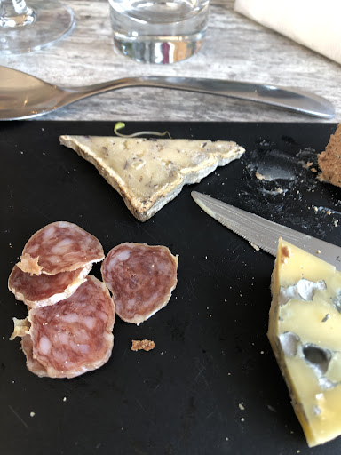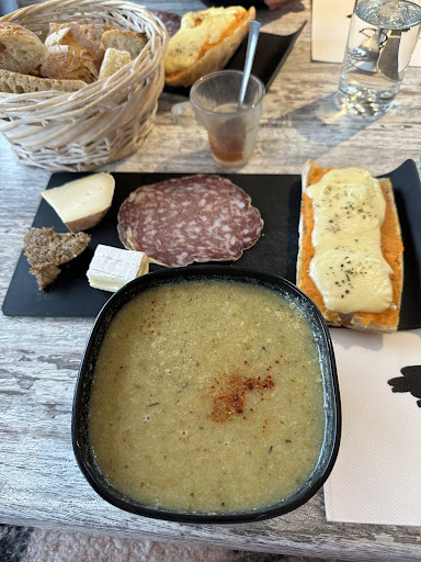 Read moreTrès déçue par la planche, tartine avec qq gros morceaux de patates douces… fromage très très sec qui n’a pu fondre sur la tartine, deux petits morceaux de fromage desséchés, qq mini rondelles de saucisses et une cuillère à soupe de terrine …le potage froid ,poire carotte cumin, très fade aussi . Le dessert, catastrophique! Tarte poire chocolat ( rond de pâte feuilletée, du chocolat et 3 tranches de poire ayant vécues… accompagné d’une boule de glace. Seul point positif le verre de vin. L’annonce du dessert est tarte poire -chocolat(pas de glace annoncée)Les poires sont desséchées et non trempées dans le chocolat, les quantités sont une chose la qualité une autre.Je suis venue plusieurs fois auparavant , service et qualité était au rdv. Bon...