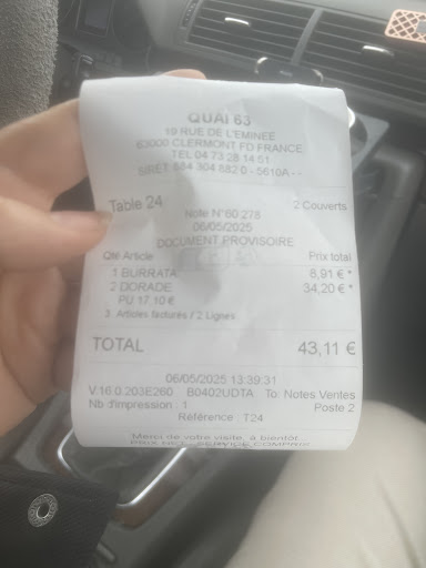 Read moreDécevant! Ambiance triste et glaciale avec un restaurant quasiment désertique (4 à 5 tables occupées vers 20H30 tout au plus). Nous avons compris pourquoi par la suite...! La carte part dans tous les sens (tapas, street-food. burger, nems, onglet de boeuf, etc) avec au final très peu de poissons et fruits de mer! De plus cette carte est écrite avec des caractères trop petits compte tenu de l'éclairage ambiant! Nous aurions préféré des propositions de "vraies" entrées cuisinées plutôt que des tapas simplement plongés dans de l'huile à friture. Une pincée de pop-corn pour prendre l'apéritif tellement confidentielle et ridicule qu'il vaudrait encore mieux ne rien mettre du tout! Mis à part le décor très beau qui pourrait éventuellement évoquer un bateau, la mer, etc..., ce restaurant n'a plus grand chose de l'identité d'un restaurant à poissons et fruits de mer! Concernant les tapas : 7,90 euros pour 5 accras de poisson et 7,50 euros pour une petite poignée de friture d'éperlan c'est trop cher pour ce que c'est vu la taille des portions! La Dorade entière était correcte, en revanche les supions en persillade à la sicilienne étaient noyés dans un coulis de tomates et on cherche encore la persillade (22 euros pour ça et vu la quantité c'est encore une fois bien trop cher!). En accompagnement le riz (sec), les frites (très grasses) ne sont aussi vraiment pas extraordinaires et ne parlons pas encore de la taille des portions...! 4 euros de supplément pour de la truffade, quelle honte (on est en Auvergne M)! En centre ville de Clermont-Ferrand pour 35 euros par personne on trouve des restaurants bistronomiques qui pour ce tarif proposent entrée + plat + dessert avec un autre niveau de cuisine et de qualité!!! Tellement déçus du rapport qualité prix que nous avons préféré quitter ce restaurant sans tenter l'expérience des desserts qui déjà de toutes façons ne nous ont pas séduits par leurs énoncés sur la carte! Enfin, du personnel gentil, qui semble étonné lorsque lors de l'addition nous avons l'honnêteté et la sincérité de dire que nous ne sommes pas très satisfait par cette expérience au QUAI 63! Je pense que nous ne reviendrons pas s'il n'y a pas de...