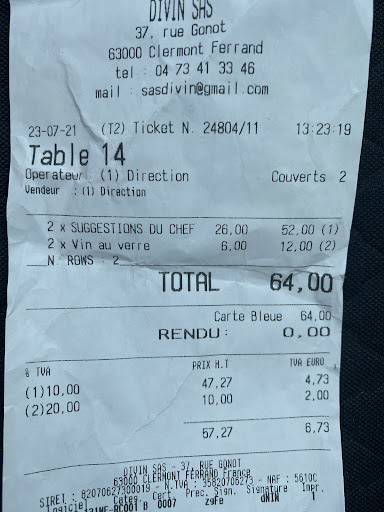 A recommander vivement. J'ai été invité pour mon anniversaire au Divin. Ce restaurant porte bien son nom. C'est à chaque fois Divin. Accueil chaleureux et convivial. Patron qui donne de sa personne. Service parfait. Un des meilleurs restaurants de Clermont-Ferrand rapport qualité-prix.