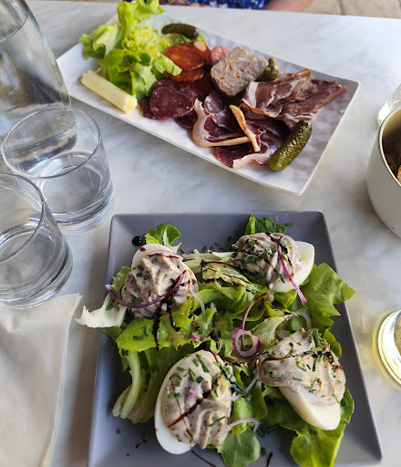 Read moreTras 10 días recorriendo entrañables pueblos llenos de gente amable por toda la costa francesa, de vuelta a España, nos pareció bien desviarnos a este restaurante, qué tan apetecible parecía a cenar, era algo pronto 18:15, pero bueno, podíamos adaptarnos y en google salía que cerraban a las 21:30. Al entrar nos contestaron muy bordes que no estaban abiertos (todas las luces encendidas, y varias personas dentro con todas las mesas montadas), nos quedamos con cara de tontos por haber convertido un día de 6h de coche en 7h, total que nos disponemos a continuar el viaje, y nuestras parejas necesitaban pasar al baño, a lo que respondieron que era solo para clientes, total, pidieron una botella de agua para llevar (3€) y pasó una de ellas, y cuando fue a pasar la segunda, le dijo que comprase una segunda botella porque si las dos quieren usar el baño, las dos deben ser clientas, resumen, 6€ por hacer pis tras desviarnos 1h entre el Mont Saint Michel y Arcachon. La comida no dudo que esté rica, pero habiendo tantos sitios para elegir, jamas pisaría ni este pueblo (salvo que quieras visitar una bodega), bastante lúgubre y desangelado, ni mucho menos este...