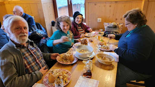 Nous sommes arrivés en bus vers 13h15 à 52 personnes environ, nos trois grandes tables étaient réservées à l'extérieur sous une grande vérandas couverte mais ouverte sur les côtés, avec une belle vue sur un grand pré et la forêt environnante. Il y avait à ce moment là déjà, à vue de nez, au moins 60 personnes installées à l'extérieur comme nous et environ 30 personnes à l'intérieur. L'établissement est adapté à autant de monde avec peut-être deux exceptions près dont je parlerai plus bas. Le service était efficace et rapide pour tout ce monde, mais visiblement excédé par toute ces demandes diverses et variées et ça se comprends. Le repas, intégralement réalisé sur place, était composé d'un bretzel frais avec l'apéro, d'une salade composée de diverses crudités et d'un morceau de saumon en gravlax, de bouchée à la reine et de mehlkneppfle, et d'une grande tranche de vacerin glacé. EXCELLENT !!! Le repas fut très copieux, très bon et avec beaucoup de goût. Pour autant de monde faire du fait maison, je dis bravo, ça se sentait dans l'assiette et le service repassait pour le plat principal pour reservir. J'en parlais plus haut deux petits bémols à cette belle expérience, le paiement et les sanitaires. Il a fallut donner un numéro de tables pour régler les consommations et dire ce qu'on avait bu après 1/2 heure de file d'attente qui gênait le service et les autres clients. Quelle confiance dans la clientèle pour autant de monde, il faudrait peut-être s'organiser autrement ??? (Paiement direct des consommations à table ou donner des tickets à chaque client indiquant ce qu'il a bu ???) Les sanitaires, pour autant de monde, sont largement sous dimensionnés. Là aussi il a fallut faire la queue. Un wc hommes un wc femmes, il y avait peut-être d'autres sanitaires ailleurs mais tout le monde a été redirigé vers ces lieux uniques. Je ne vous décris pas les lieux après autant de passages.... Malgré ces deux points noirs l'expérience fut tout de même très apprécié globalement. Nous y reviendrons à l'occasion d'une randonnée...