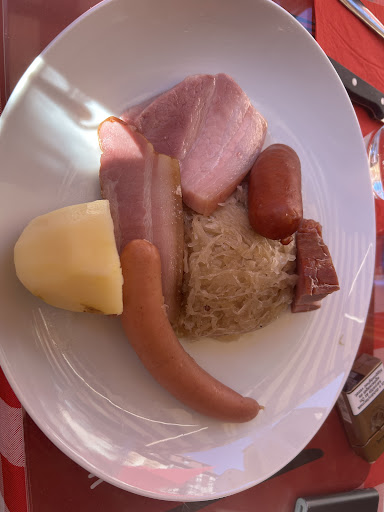 Read moreThe food here was okay. My husband got the Choucroute with sausages and ham. The ham was a bit dry but the sausages were tasty. The Sauer kraut was mildly seasoned. I got the Baeckoffe, which had potatoes, carrots and some kind of pork, also mildly seasoned. Nothing exceptional about either dish. What warranted the two star rating was the service. Plates were slammed on our table with barely a word. We were never asked how the meal was... incivility is the word that comes to mind. I am not sure whether it was because we were American (we do speak German fluently) or if we had initially asked if it would be possible to share a meal. Either way, there really is no excuse for us to have been treated in this manner. Very disappointing. Our dinners are typically the highlight of our...