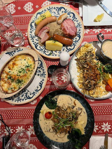 I got the Zwiebelkuchen as a starter, but it could easily be a main if you are only a little hungry. Then I got the Fleischküchle with a mushroom cream sauce and Spätzle. It had a few vegetables and truffle oil as garnish. The truffle oil really took the sauce to the next level. Everything was cooked perfectly. They were the most melt-in-your-mouth delicious meatballs I've ever had!