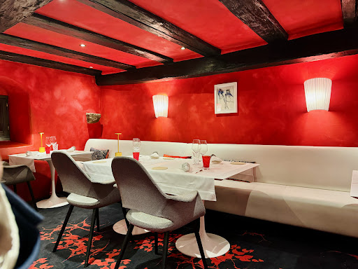 Read moreMet 17 gm. een van de betere restaurants in de omgeving van Colmar. Gevestigd in een 16e eeuws pand in het hartje van Riquewihr. Het mooie smeedijzeren uithangbord verraad dat je goed zit. Je loopt door de grote poort en komt op de bescheiden binnenplaats met rechts de keuken en links aan de muur een hangende tuin vol met planten, mooi. We werden door de maître opgehaald en kregen een plaatsje in de serre waar het dakvenster voor voldoende daglicht zorgde. Het restaurant gedeelte lag hoger en was wel heel apart ingericht. Een donkerrode kleur met bruine constructiebalken, links een hoger gedeelte met een “wolk” van glas, rechts een lager gedeelte waar je nauwelijks kunt staan, speciaal.