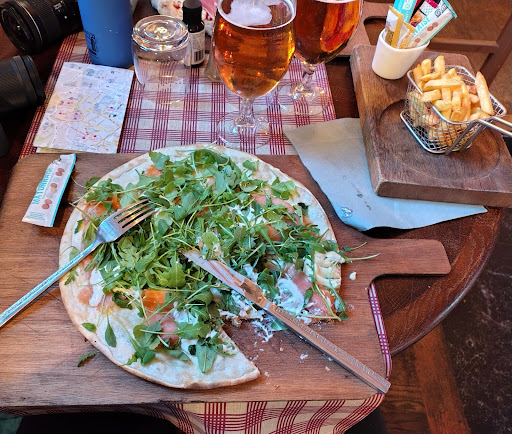 Read moreWe are Anglo/Australians so we tend to have a substantial breakfast and skip lunch then start feeling hungry about 4-5pm. Unfortunately for us the French tend to stick to more rigid meal times. So, finding a restaurant that will serve food late in the afternoon is difficult. However, we came to this restaurant and to our delight it was serving food. I decided to try the traditional Tarte Flambe and ordered the one with smoked salmon. It arrived promptly and was fresh and delicious with loads of smoked salmon balanced by a pile of healthy spinach scattered over the top (so no need to order extra salad!). My other half had the Pizza des Copains which he enjoyed, especially as it came with generous amounts of ham. The staff were all attentive and pleasant. I'd definitely return to this restaurant if I was in...