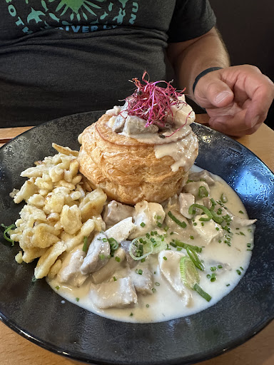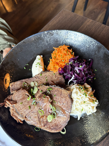 Read moreOn a rainy Sunday afternoon this place seemed like a good spot for an afternoon lunch. Seated upstairs with a view of the square ( too cool and wet to use the waterside patio) felt right. Things went downhill from there. Going over the menu there were 5 entrees that looked interesting and between 4 of us we could then share 2 mains. Not so fast, the young waiter explained, there would be a €7 surcharge per person on the entrees. “ this is a restaurant not a bistro” he explained wearing his black tee shirt with the restaurant name printed across the back. In fairness there was a red notice on the menu about the surcharge atop the entree section, translated to English it made no sense. So scratch the entrees, mains all around. Chicken and veal in puff pastry was fine, braised beef was tender enough although the various shredded vegetables were very bistro-like. Beef carpaccio was 10 see-through slightly salty slices. Then came the veal cordon blu, more like cordon noir. A rolled up charred lump. It was not revenge of the kitchen 2 identical lumps arrived at an adjoining table . Over done as it was the crust was acrid ( not the tasty golden brown normally found ) and left a bitter after taste. The spetzel that came with it was room temperature, dry and chewy…maybe that’s the way it’s supposed to be served. At least the bread was fresh and tasty, but requested butter came with a supplementary charge. You will only leave this place feeling disappointed. Try somewhere else, there are plenty to choose...