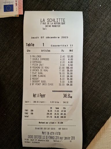 Le nom est resté, mais depuis le 1er décembre 2023, Mina et Bruno sont malheurusement partis avec l'ăme de la Schlitte. Habitués à venir en décembre pour les marchés de Noël et l'ambiance alsacienne qui se ressentait dans l'accueil de Mina et la cuisine de Bruno, nous avons été extrêmement déçus avec l'impression de se retrouver dans un routier quant au choix des plats. L'accueil reçu par la serveuse qui était là avant, est lui resté chaleureux et toujours souriante. Je ne parlerai pas des "suggestions" imposées, je ne les ai pas goûtées. Pas de poisson pour les végétariens. En revanche la majorité d'entre nous a pris des rognons tièdes que nous avons trouvés par hasard sous les champignons. Un bon point pour les spetzeles qui étaient très bons. Pour les desserts, de l'industriel, rien de fait maison, même pas une portion de tarte (cf. Photo de la carte), la dame blanche on retrouve des morceaux de glace, montrant un problème de froid.. Nous avons souhaité laisser une chance au nouveau propriétaire, mais désormais nous passerons notre chemin. Je tiens à preciser que cet avis transcrit une impression personnelle et celles des 10 personnes qui m'accompagnait ainsi que les 2 tables voisines, sans compter les nombreuses personnes qui ont fait demi tour en voyant...