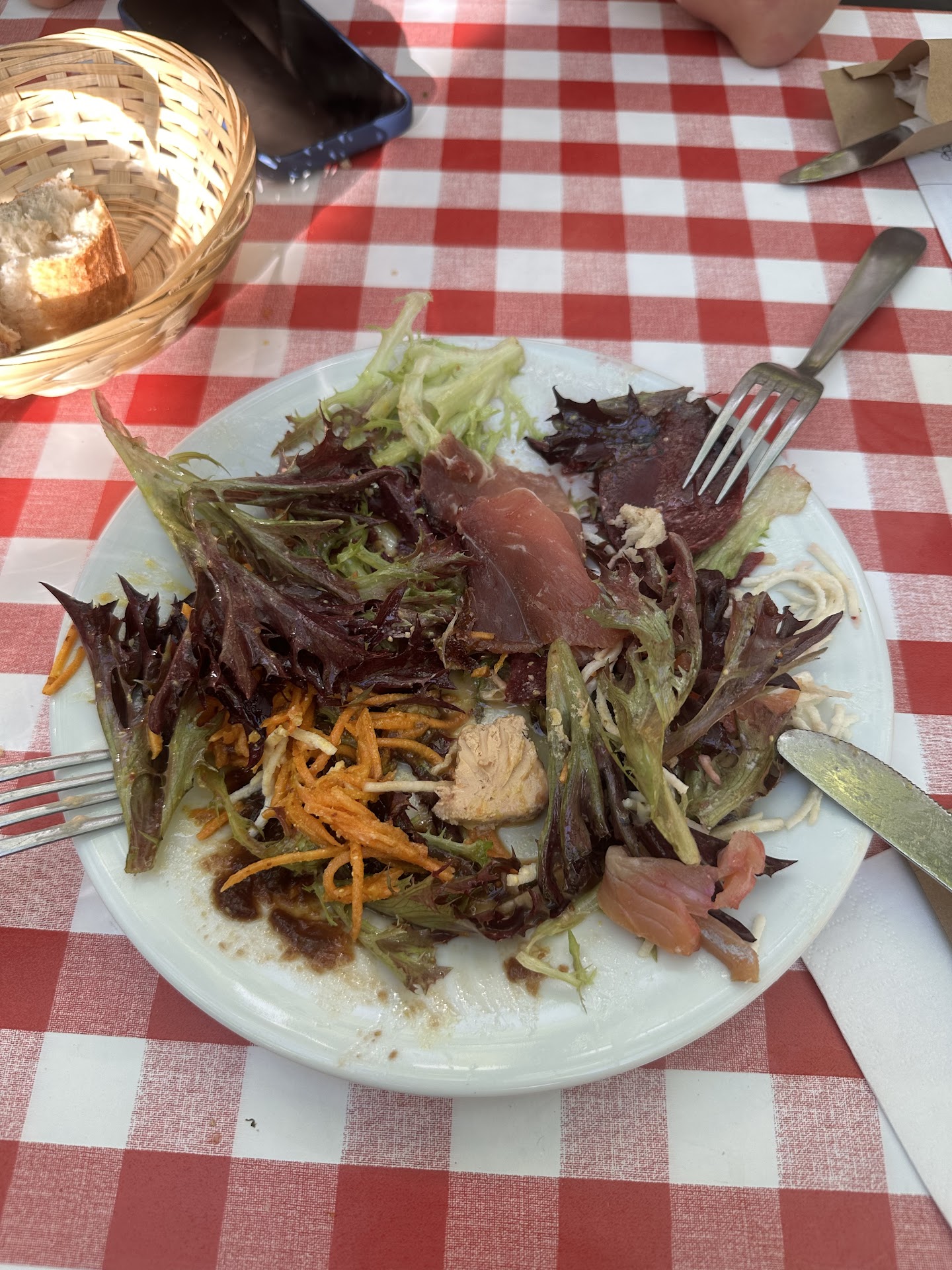Le premier a commandé un menu à 35€ et une bière à 7€... déjà, le prix pique pas mal. il a eu une petite salade gourmande dont la salade verte était cuite par la vinaigrette certainement préparée trop tôt et en attente depuis longtemps. la salade était accompagnée de trois tranchettes de pain d'environ 1cm d'épaisseur pour un diamètre classique de baguette. Le pain doit coûter cher par ici. Ensuite un cordon bleu fait maison hyper sec dont on avait oublié le fromage à l'intérieur et des spatzles pas assez cuites. Pour finir, un "chaume" alors qu'il avait demandé une tarte mais je reviendrai sur cette pâtisserie un peu plus loin.